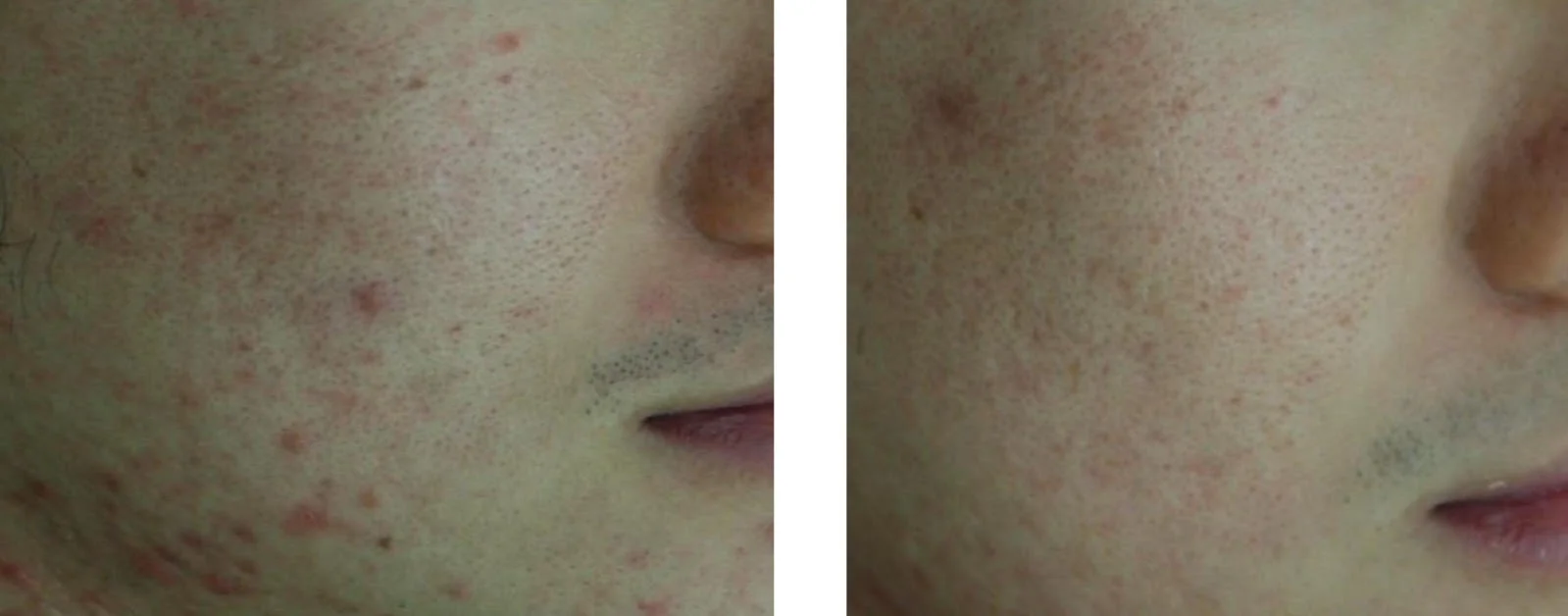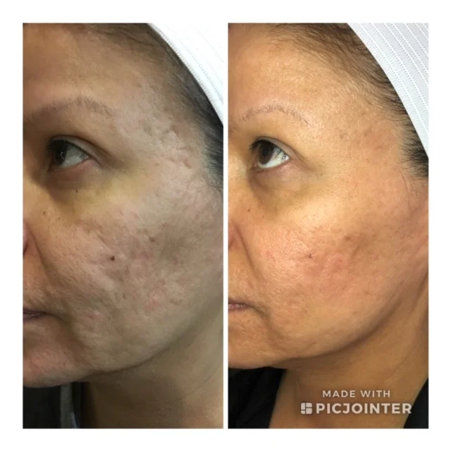 Acne Scaring Before and After 3 Vivace RF Microneedling with Human Growth Factor Serum and a 4th with PRP.
